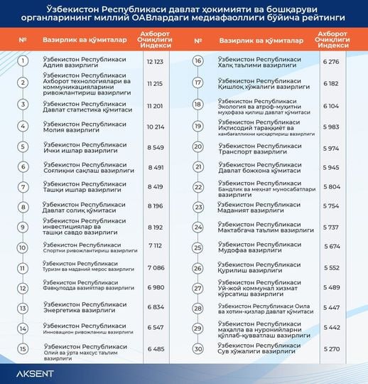 2022-yilning 31-dekabr holatiga koʻra, tuzilgan mazkur reyting Oʻzbekistonda yetakchi hisoblangan 50 ta OAVda eʼlon qilingan davlat hokimiyati va boshqaruvi organlarining faoliyati toʻgʻrisidagi maʼlumotlarning tahliliga asoslanadi. Yakuniy reyting Oʻzbekiston Respublikasidagi 30 ta vazirlik va davlat qoʻmitalarining faoliyatini oʻrganishni oʻz ichiga oladi.