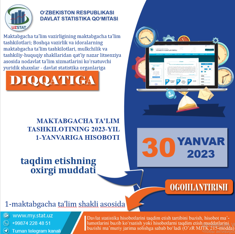 Maktabgacha taʼlim vazirligining maktabgacha taʼlim tashkilotlari; Boshqa vazirlik va idoralarning maktabgacha taʼlim tashkilotlari, mulkchilik va tashkiliy-huquqiy shakllaridan qatʼiy nazar litsenziya asosida nodavlat taʼlim xizmatlarini koʼrsatuvchi yuridik shaxslar - davlat statistika organlariga