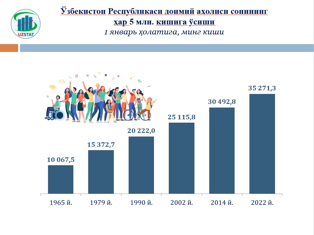 Davlat statistika qoʼmitasi maʼlumotlariga koʼra, Oʼzbekiston Respublikasi doimiy aholisi sonining har 5 mln. kishiga oʼsishi: