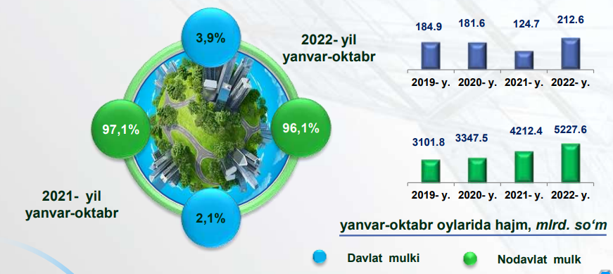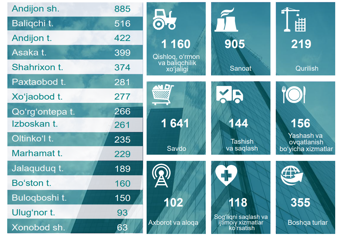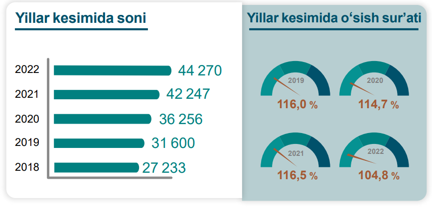 2022- yil 1- noyabr holatiga koʻra faoliyat ko‘rsatayotgan korxona va tashkilotlar soni oʻtgan yilning mos davriga (42 247 ta) nisbatan 2 023 taga oshib, oʻsish surʼati 104,8 foizni tashkil etdi.