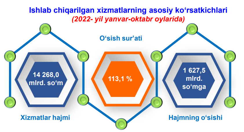 2022- yil yanvar-oktabr oylarida ko‘rsatilgan bozor xizmatlari hajmi 14 268,0 mlrd. so‘mga yetdi. Taqqoslama ekvivalentda o‘tgan yilning shu davriga nisbatan o‘sish sur’ati 113,1% ni tashkil etdi.