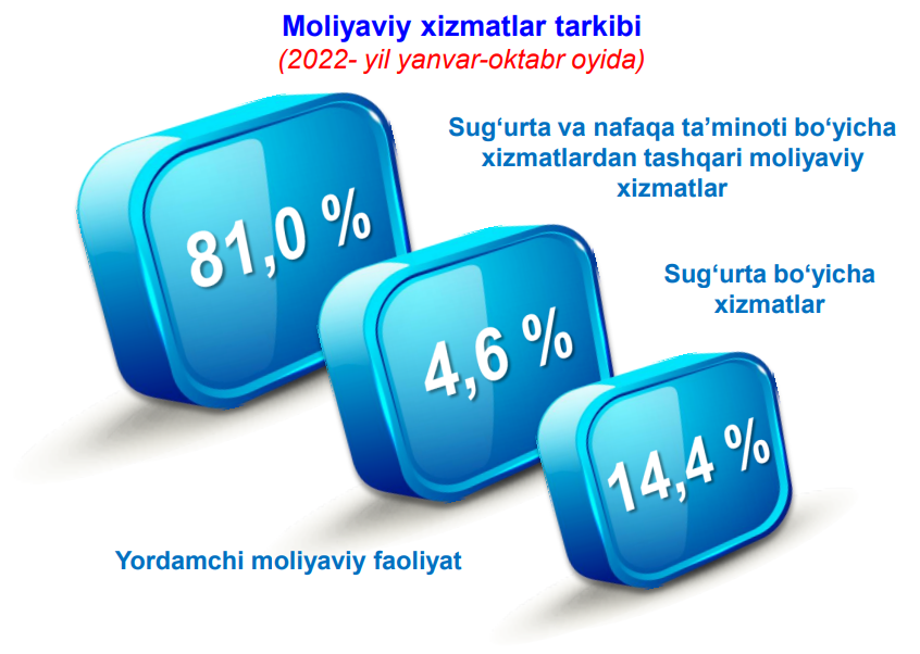 Moliyaviy xizmatlar umumiy hajmida sug‘urta va nafaqa ta’minoti bo‘yicha xizmatlarda moliyaviy xizmatlarning ulushi 81,0 % ni tashkil etdi. 2022- yilning yanvar-oktabr oylari yakuniga ko‘ra sug‘urta xizmatlarining ulushi 4,6 % oralig‘ida qayd etildi.