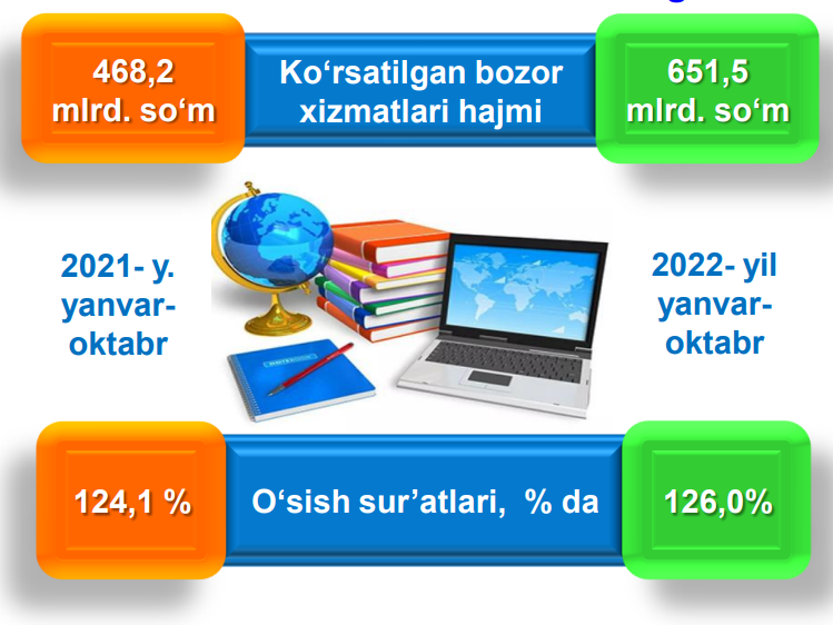 2022- yil yanvar-oktabr oylarida ta’lim sohasidagi xizmatlar hajmi 651,5 mlrd. so‘mga yetib, bozor xizmatlari umumiy hajmidagi ulushi 4,6 % ni tashkil etdi. 2021- yilning mos davriga nisbatan o‘sish sur’ati 126,0 % ni tashkil etdi.