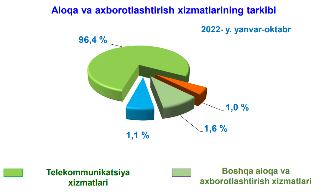 2022- yilning yanvar-oktabr oylarida aloqa va axborotlashtirish xizmatlari hajmida eng katta ulush telekommunikatsiya xizmatlariga (simli va mobil aloqa xizmatlari, internet va boshqalar xizmatlari) to‘g'ri keladi. Ularning ulushi 64,9 %ni tashkil etdi.