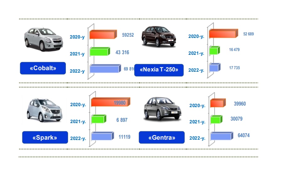 Shu bilan birga, ishlab chiqarish sanoatida o‘tgan yilning mos davriga nisbatan solishtirganda yengil avtomobillar 168,7 % ga ko‘paydi. Avtomobil ishlab chiqarish sanoatida 2022-yilning yanvar-sentabr oylarida 69 816 dona “Cobalt” (o‘tgan yilning mos davriga nisbatan 161,2 %), 17 735 dona “Nexia T-250” (107,6 %), 64 074 dona “Lacetti-Gentra” (213,0 %), 11 119 dona “Spark” (161,2 %) avtomobillari ishlab chiqarildi.