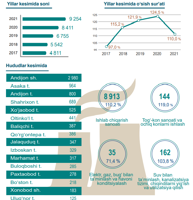 Qayd etish kerakki, sanoat tarmogʻi iqtisodiy tarmoqlar ichida eng yuqori salohiyatga ega boʻlgan tarmoqlardan hisoblanadi. Shunday qilib, soʻnggi uch yil ichida milliy iqtisodiyotda faoliyat koʻrsatayotgan sanoat korxonalari sonining oʻsish surʼati 167,0 foizni tashkil etdi. Sanoat korxonalari soni jami korxona va tashkilotlarning 22,9 foiz ulushini tashkil etdi. Shundan – 96,3 foizini ishlab chiqarish sanoati (oʻtgan yilga nisbatan oʻsish 110,2 %), 1,5 foizini togʻ-kon sanoati va ochiq konlarni ishlash (oʻsish 119,0 %), 0,4 foizini elektr, gaz bugʻ bilan taʼminlash va havoni konditsiyalash (71,4 % ni) va 1,8 foizini suv bilan taʼminlash, kanalizatsiya tizimi, chiqindilarni yigʻish va utilizatsiya qilish (oʻsish 103,8 %) tashkil etgan.