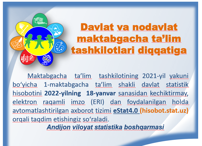 Maktabgacha ta’lim tashkilotining 2021-yil yakuni bo‘yicha 1-maktabgacha ta’lim shakli davlat statistik hisobotini 2022-yilning 18-yanvar sanasidan kechiktirmay, elektron raqamli imzo (ERI) dan foydalanilgan holda avtomatlashtirilgan axborot tizimi eStat4.0 (hisobot.stat.uz) orqali taqdim etishingiz so‘raladi.