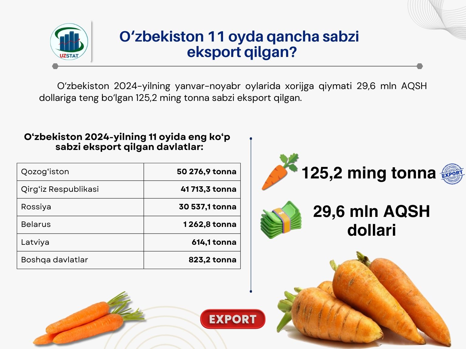 O'zbekiston 2024-yilning yanvar-noyabr oylarida xorijga qiymati 29,6 mln AQSH dollariga teng bo'lgan 125,2 ming tonna sabzi eksport qilgan.