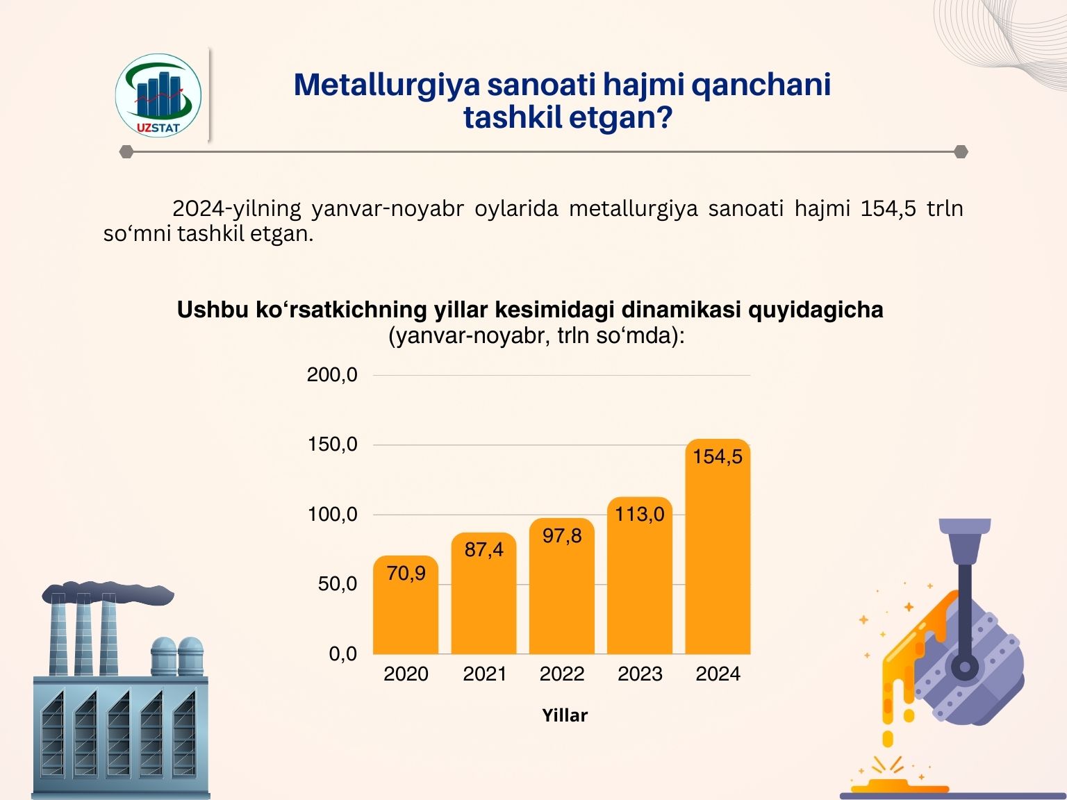 2024-yilning yanvar-noyabr oylarida metallurgiya sanoati hajmi 154,5 trln so'mni tashkil etgan.