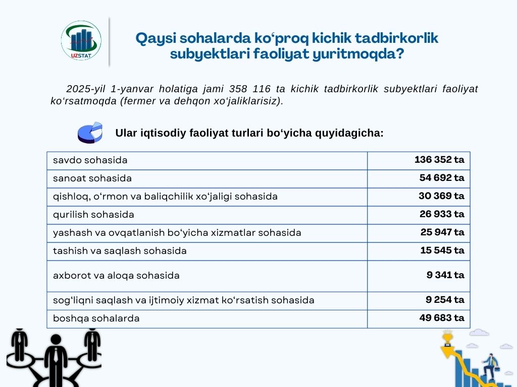 2025-yilning 1-yanvar holatiga jami 358 116 ta kichik tadbirkorlik subyektlari faoliyat ko'rsatmoqda (fermer va dehqonlarsiz).