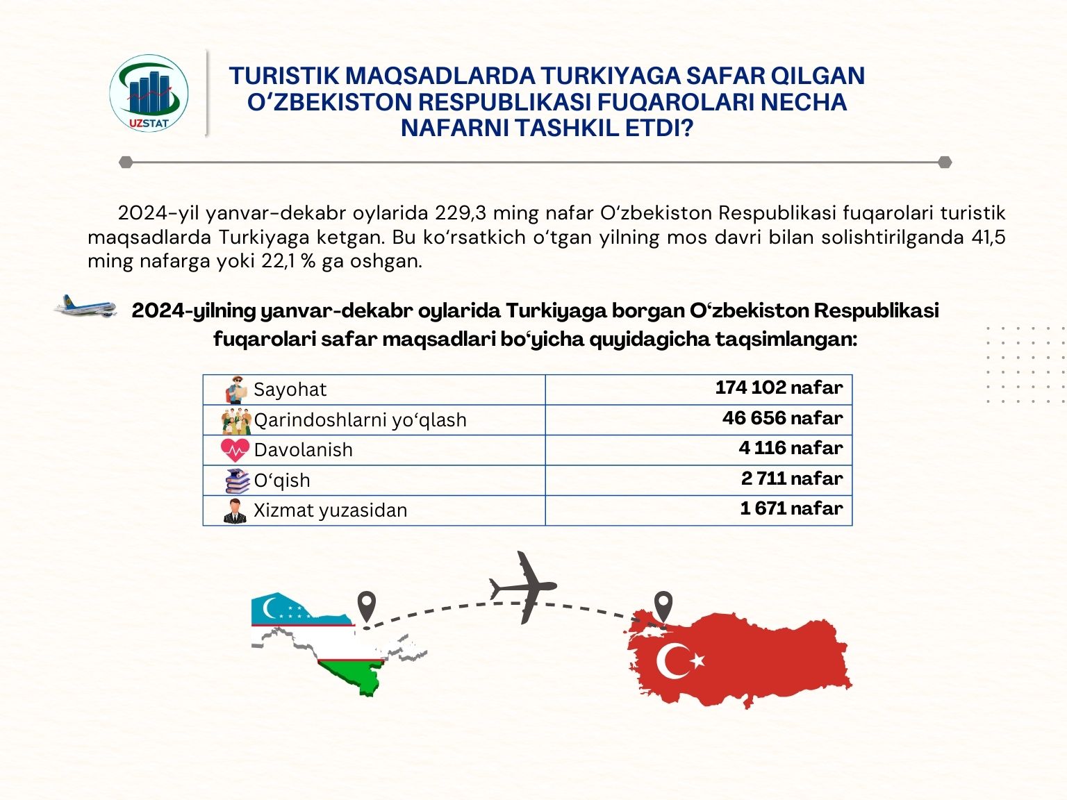 2024-yil yanvar-dekabr oylarida 229,3 ming nafar O'zbekiston Respublikasi fuqarolari turistik maqsadlarda Turkiyaga ketgan.