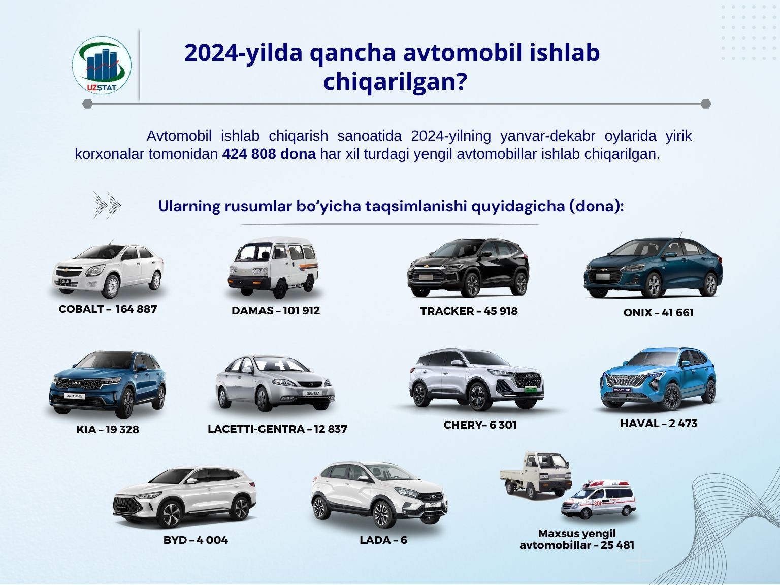 Avtomobil ishlab chiqarish sanoatida 2024-yilning yanvar-dekabr oylarida yirik korxonalar tomonidan 424 808 dona har xil turdagi yengil avtomobillar ishlab chiqarilgan.