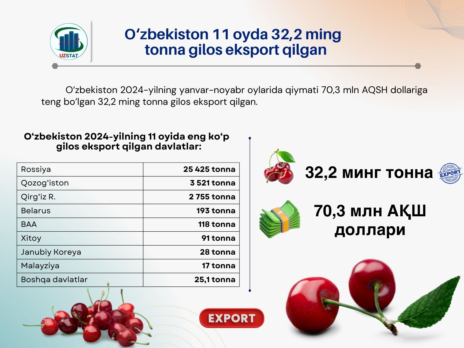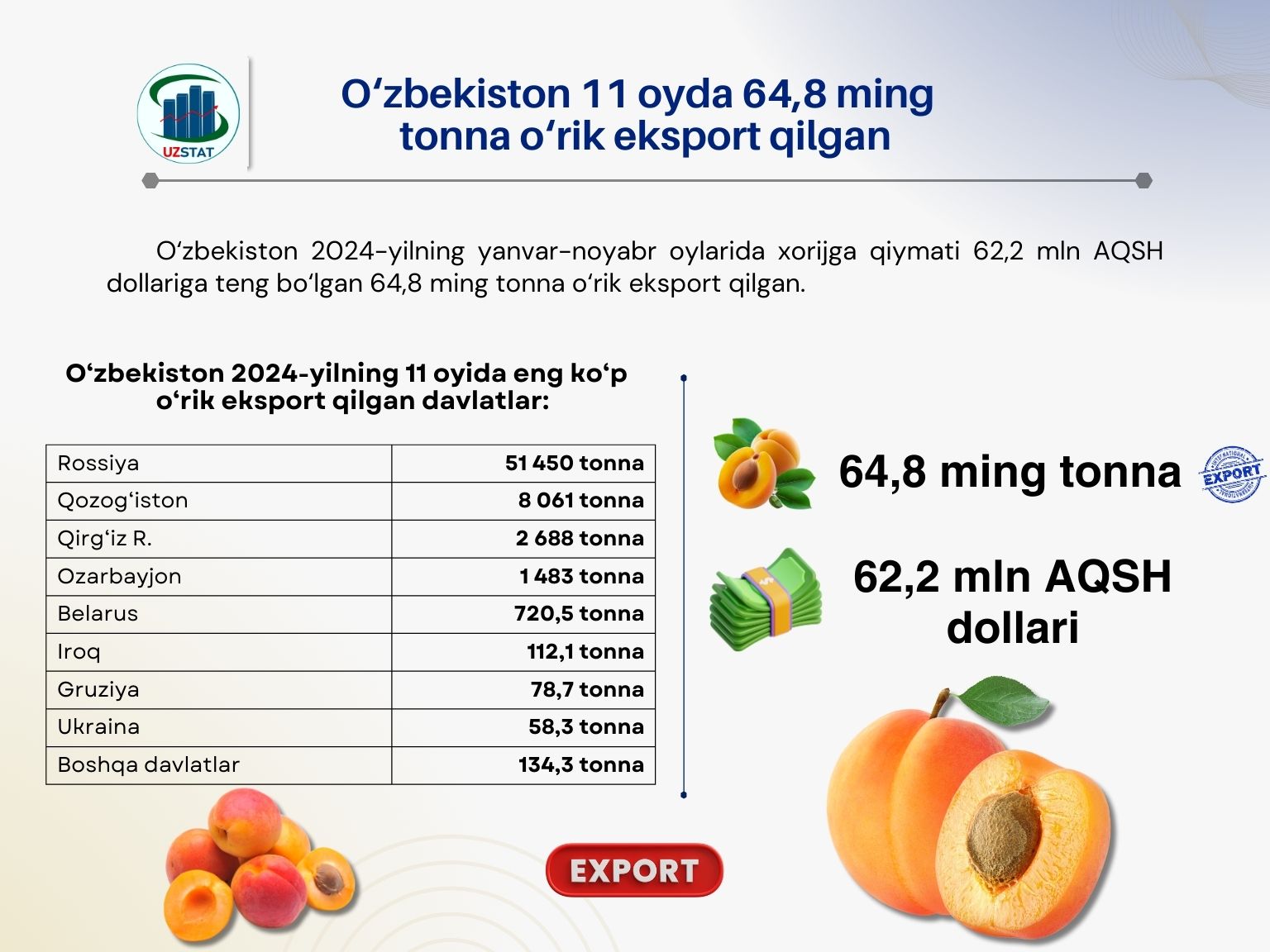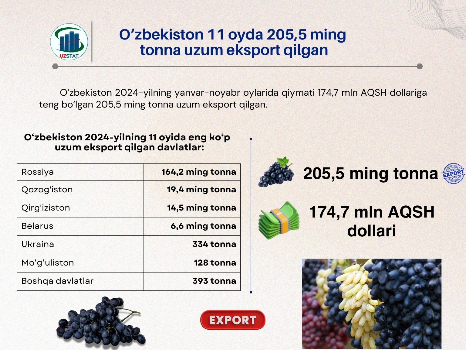 O'zbekiston 2024-yilning yanvar-noyabr oylarida qiymati 174,7 mln AQSH dollariga teng bo'lgan 205,5 ming tonna uzum eksport qilgan.
