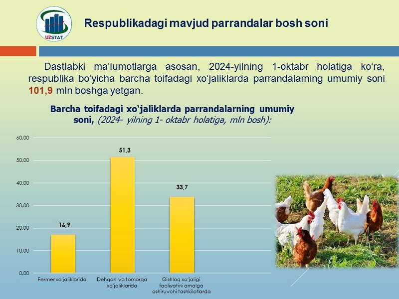 Dastlabki ma'lumotlarga asosan, 2024-yilning 1-oktabr holatiga ko'ra, respublika bo'yicha barcha toifadagi xo'jaliklarda parrandalarning umumiy soni 101,9 mln boshga yetgan.