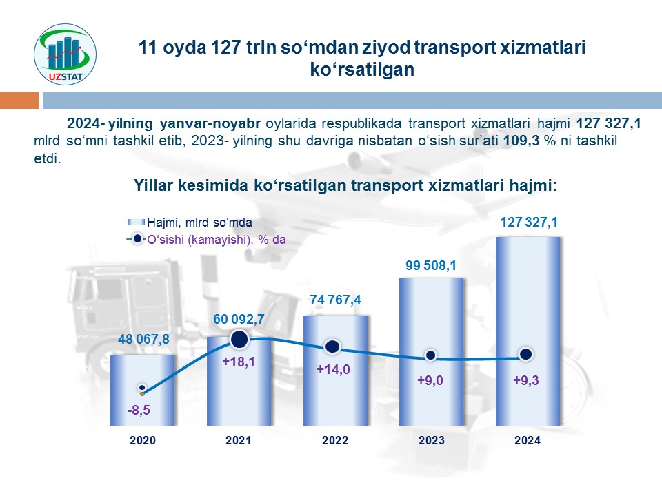 2024-yilning yanvar-noyabr oylarida respublika transport xizmatlari hajmi 127 327,1 mlrd so'mni tashkil etib, 2023-yilning shu davriga nisbatan o'sish sur'ati 109,3 % ni tashkil etdi.