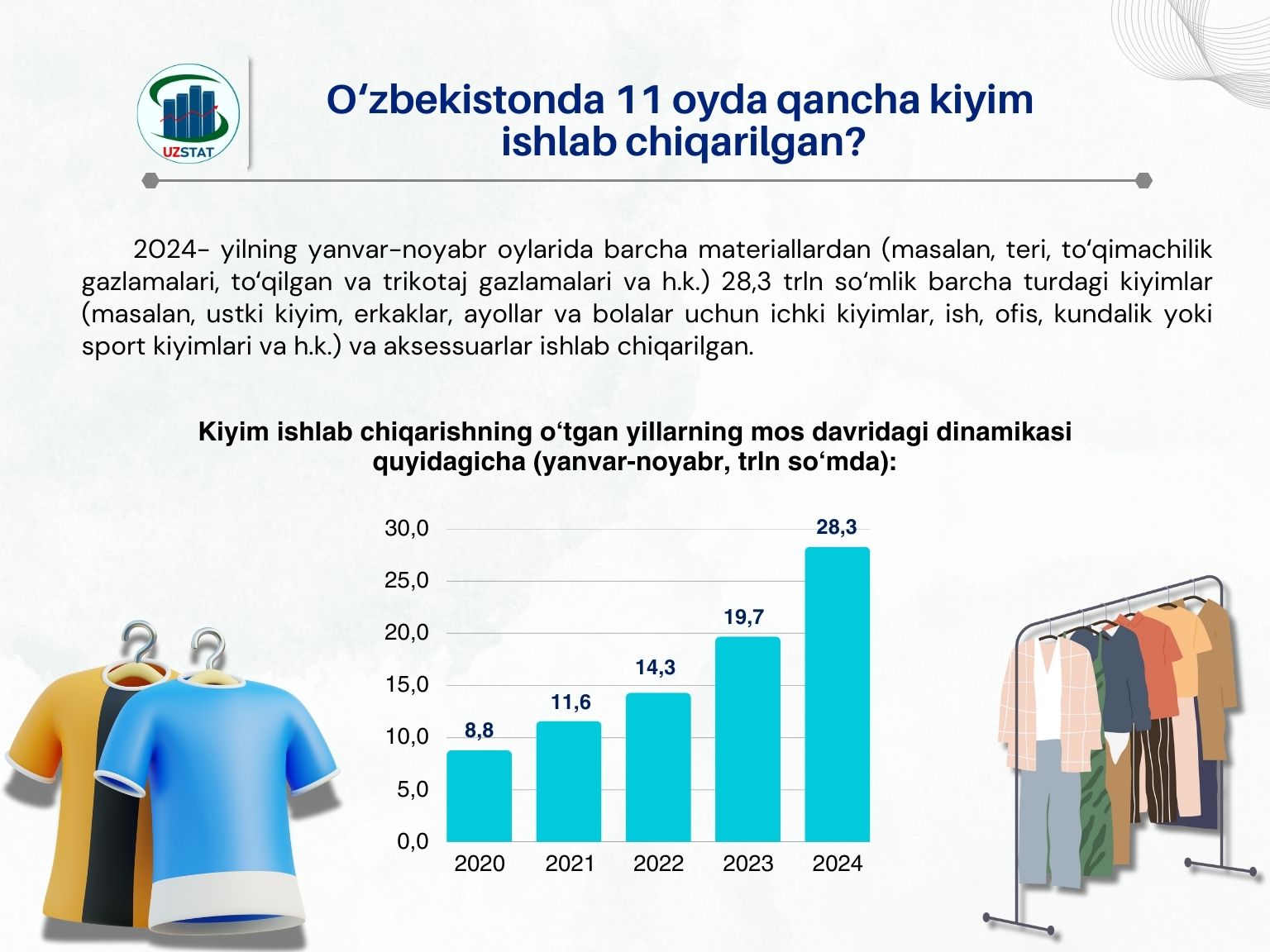 2024-yilning yanvar-noyabr oylarida barcha materiallardan 28,3 trln so'mlik barcha turdagi kiyimlar va aksessuarlar ishlab chiqarilgan.