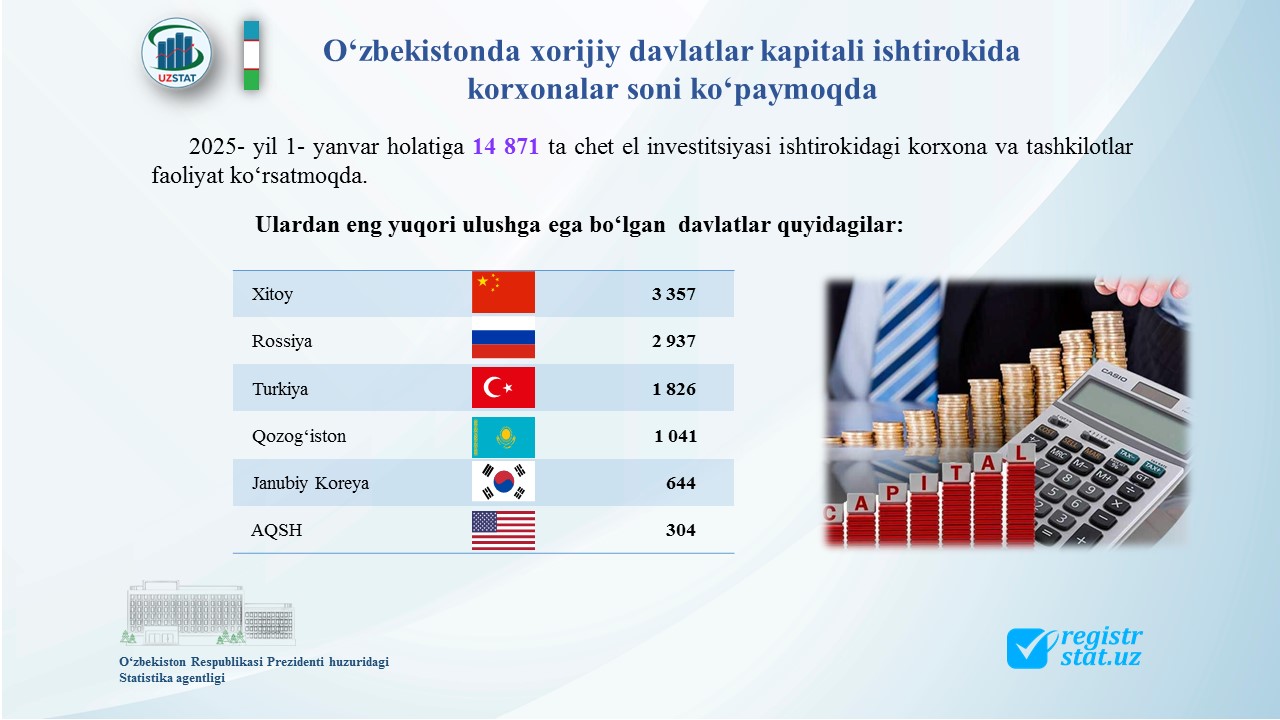 2025-yil 1-yanvar holatiga 14 871 ta chet el investitsiyasi ishtirokidagi korxona va tashkilotlar faoliyat ko'rsatmoqda.