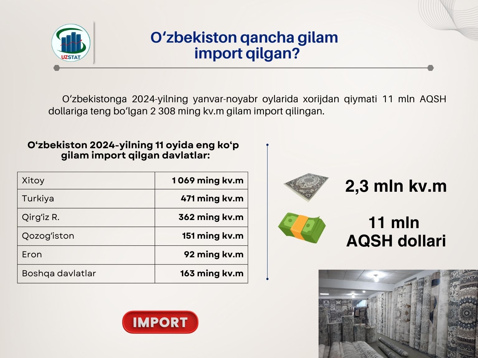O'zbekistonga 2024-yilning yanvar-noyabr oylarida xorijdan qiymati 11 mln AQSH dollariga teng bo'lgan 2 308 ming kv.m gilam import qilingn.