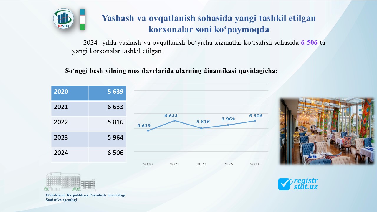 2024-yilda yashash va ovqatlanish bo'yicha xizmatlar ko'rsatish sohasida 6 506 ta yangi korxonalar tashkil etilgan.