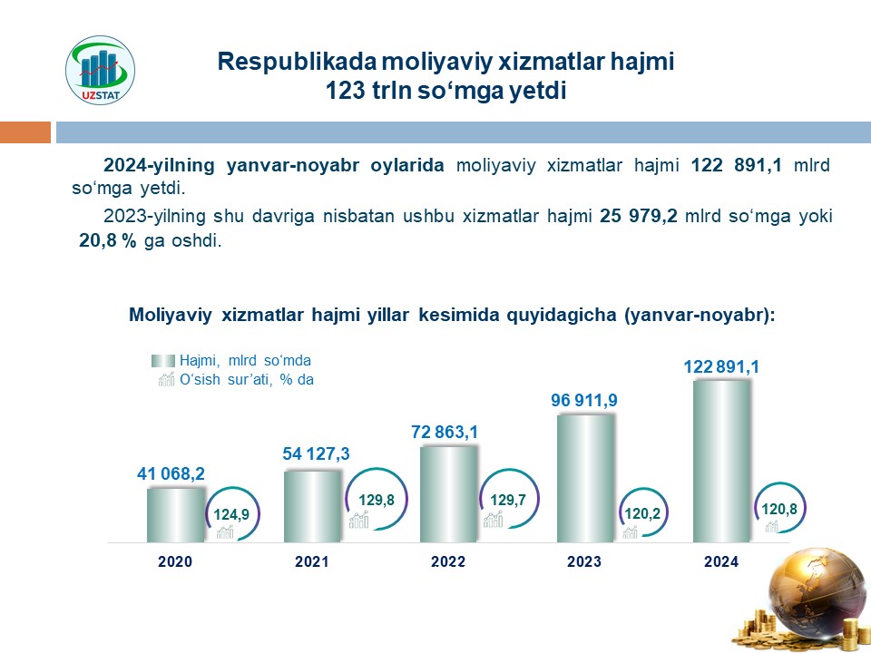 2024-yilning yanvar-noyabr oylarida moliyaviy xizmatlar hajmi 122 891,1 mlrd so'mga yetdi.
