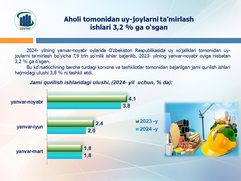 2024-yilning yanvar-noyabr oylarida O'zbekiston Respublikasida uy xo'jaliklari tomonidan uy-joylarni ta'mirlash bo'yicha 7,9 trln so'mlik ishlar bajarilib, 2023-yilning yanvar-noyabr oyig nisbatan 3,2 % ga o'sgan.