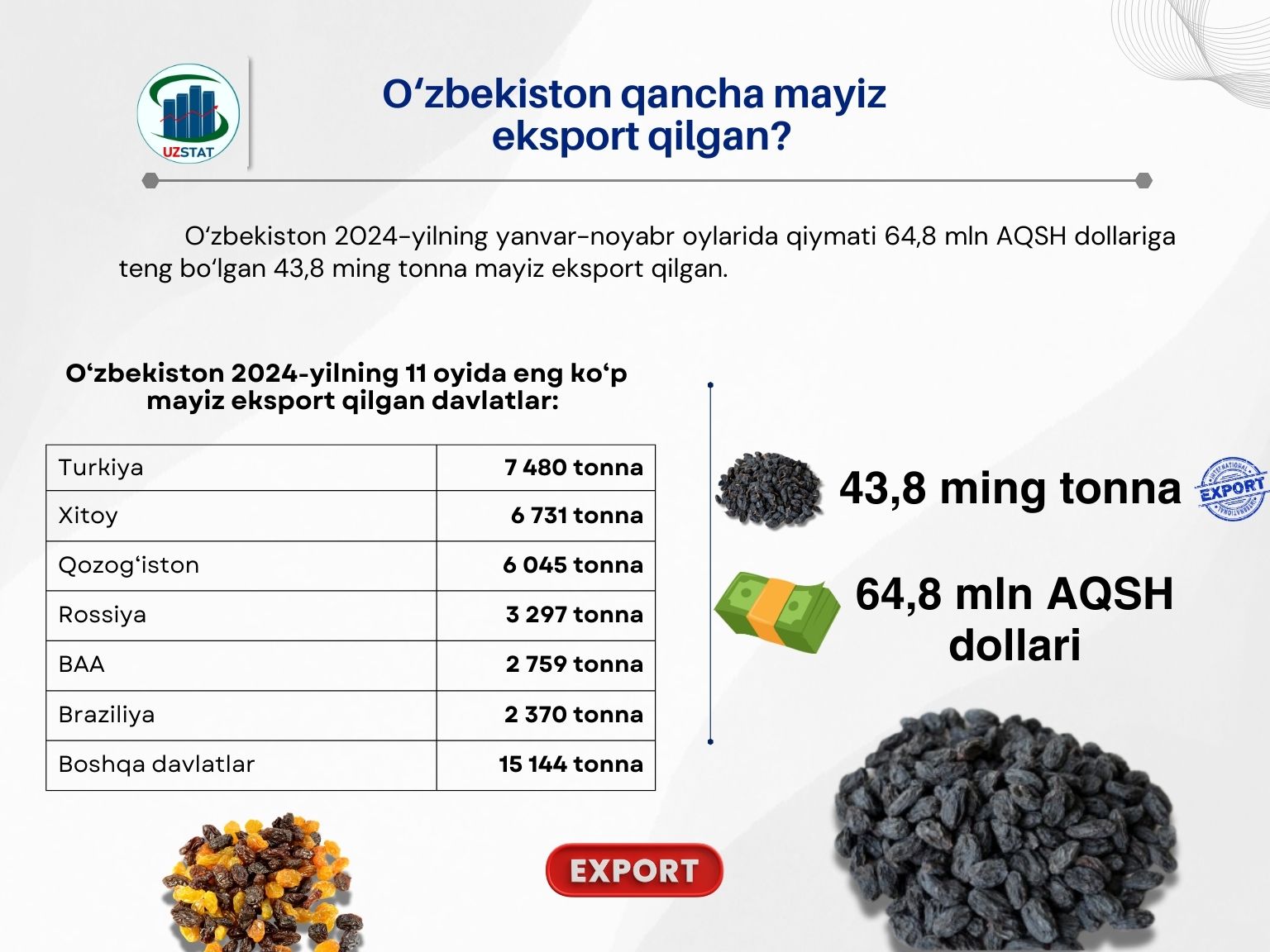 O'zbekiston 2024-yilning yanvar-noyabr oylarida qiymati 64,8 mln AQSH dollariga teng bo'lgan 43,8 ming tonna mayiz eksport qilgan.