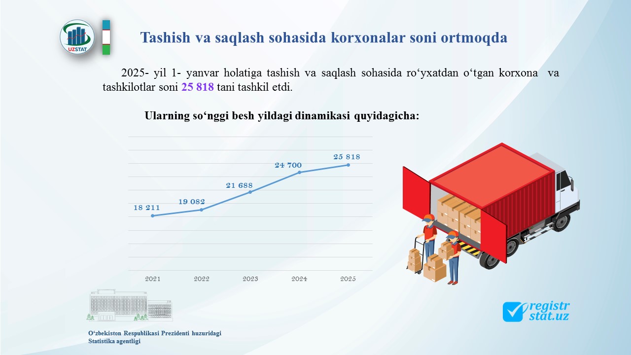 2025-yilning 1-yanvar holatiga tashish va saqlash sohasidagi ro'yxatdan o'tgan korxona va tashkilotlar soni 25 818 tani tashkil etdi.