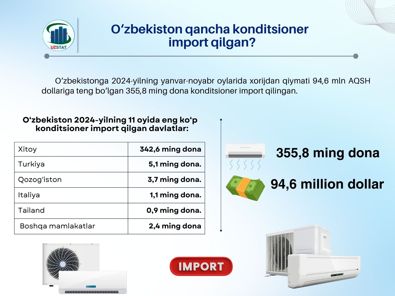 O'zbekistonga 2024-yilning yanvar-noyabr oylarida xorijdan qiymati 94,6 mln AQSH dollariga teng bo'lgan 355,8 ming dona konditsioner import qilingan.