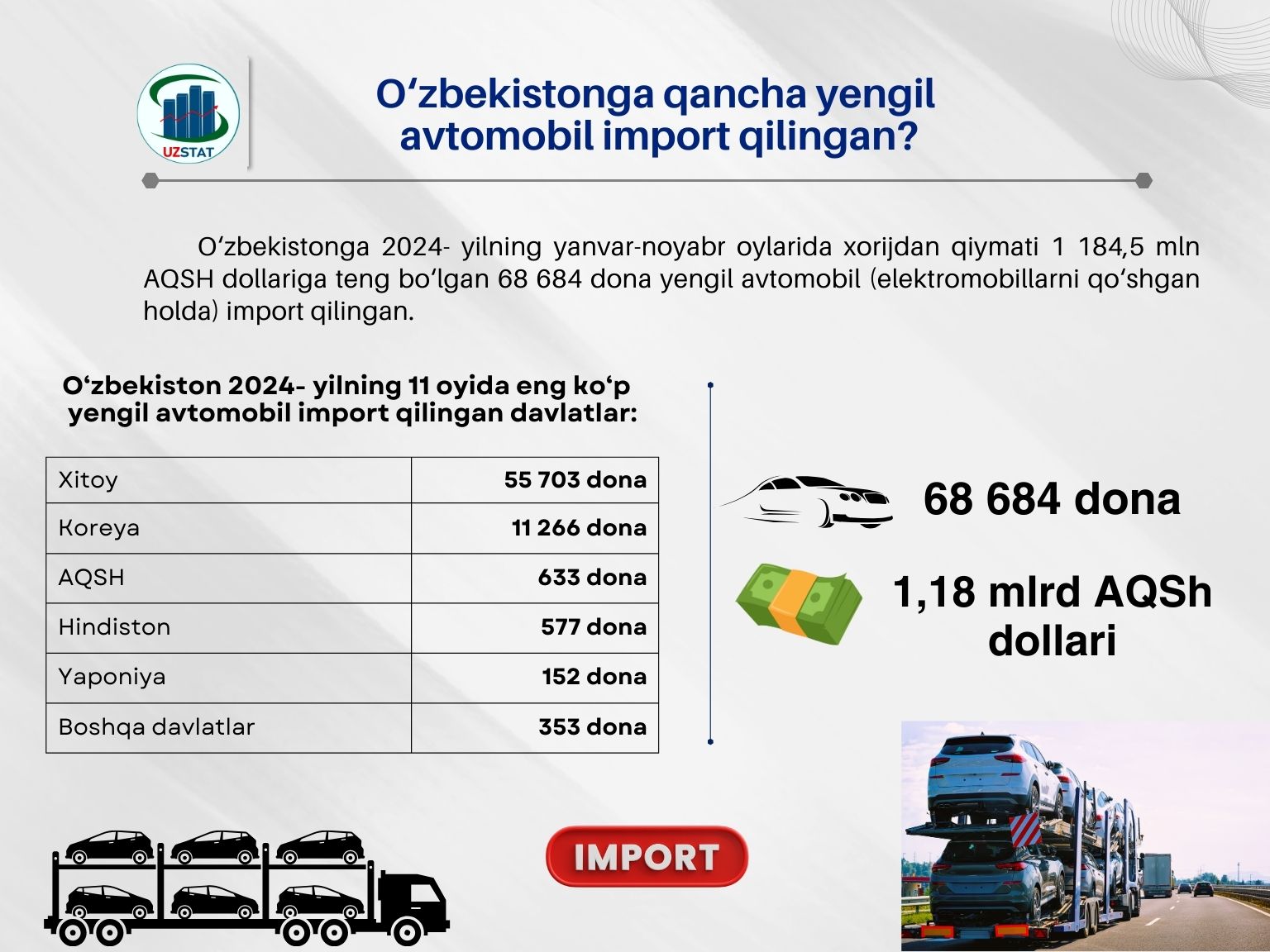 O'zbekiston 2024-yilning yanvar-noyabr oylarida xorijdan qiymati 1 184,5 mln AQSH dollariga teng bo'lgan 68 684 dona yengil avtomobil (elektromobillarnu qo'shgan holda) import qilingan.