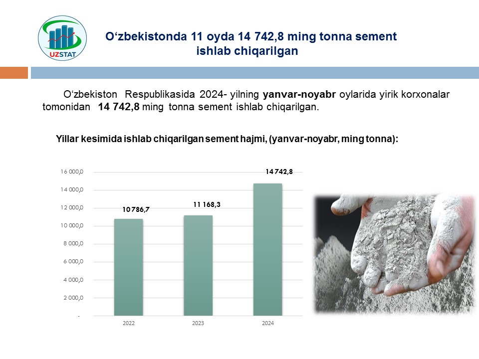 O'zbekiston Respublikasida 2024-yilning yanvar-noyabr oylarida yirik korxonalar tomonidan 14 742,8 ming tonna sement ishlab chiqarilgan.