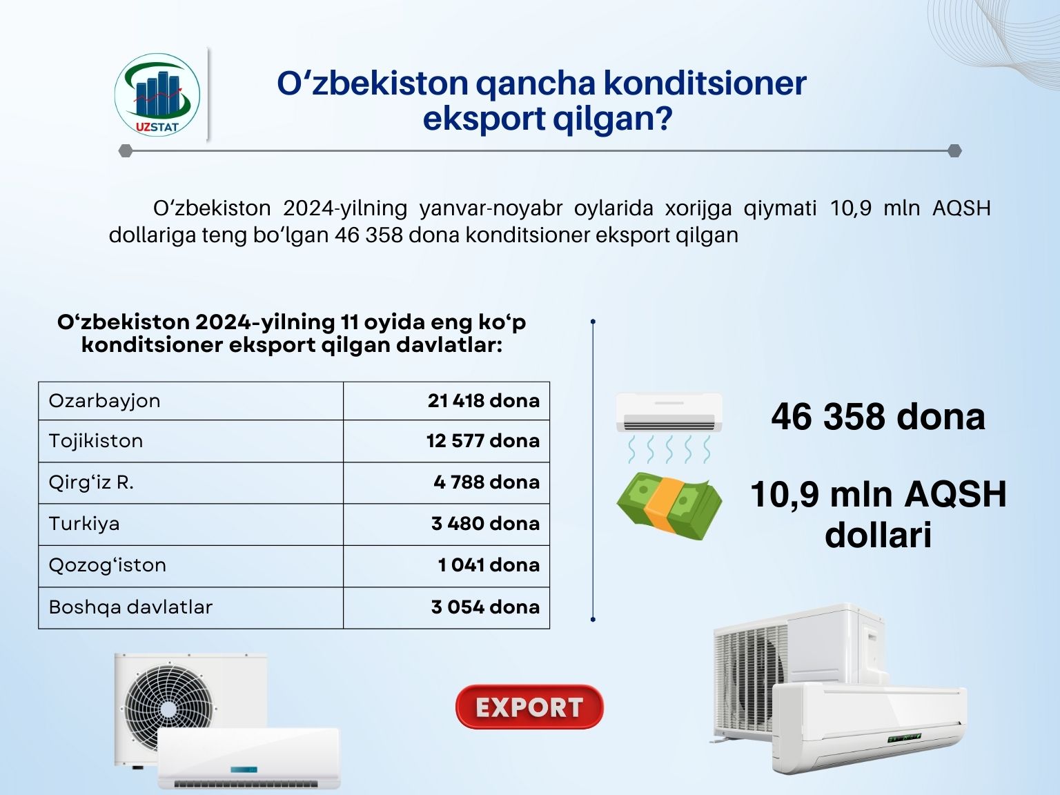 O'zbekiston 2024-yilning yanvar-noyabr oylarida xorijga qiymati 10,9 mln AQSH dollariga teng bo'lgan 46 358 dona konditsioner eksport qilgan.