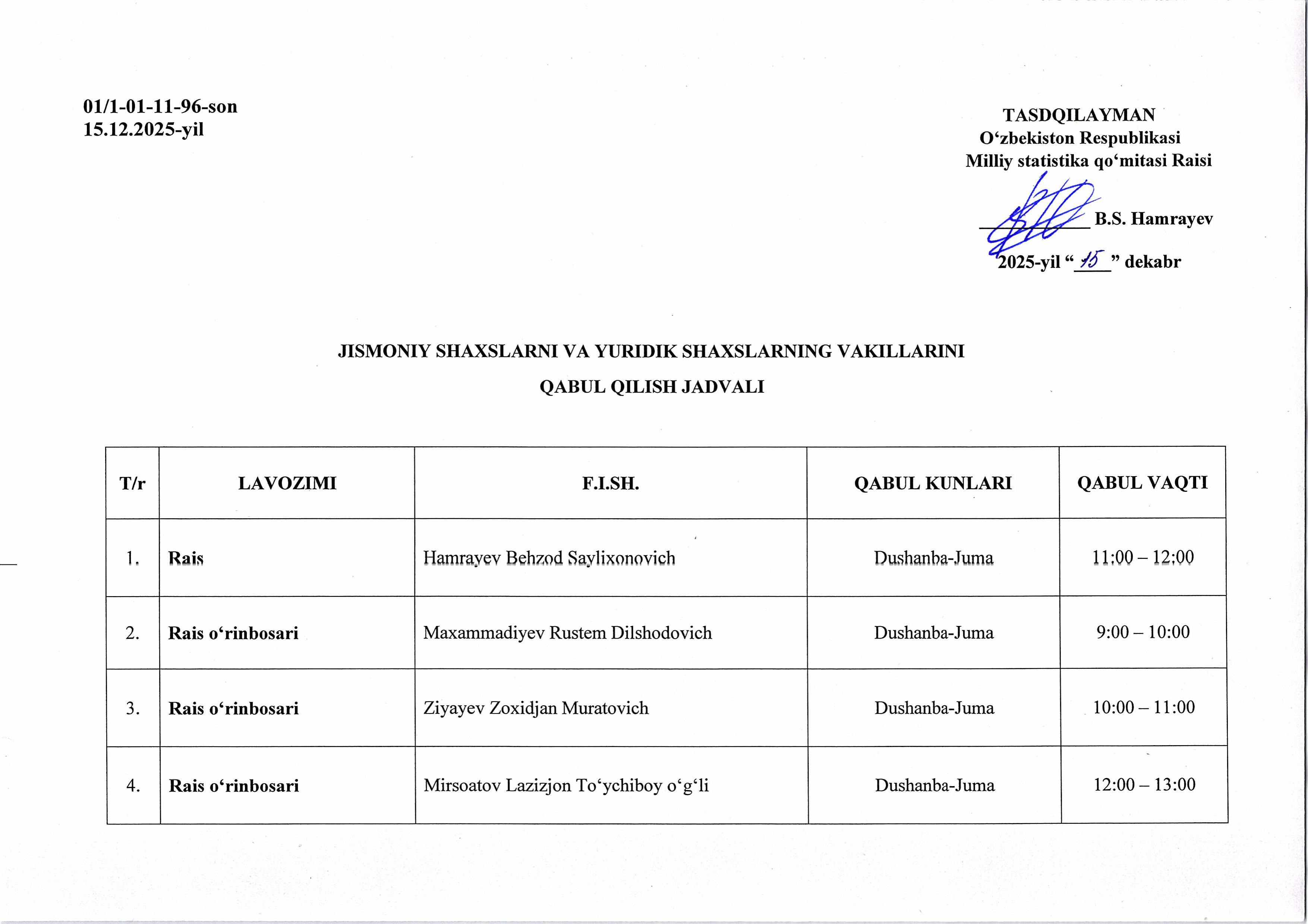 O‘zbekiston Respublikаsi Milliy statistika qo‘mitasi rahbariyatini jismoniy shaxslarni va yuridik shaxslarning vakillarini qabul qilish jadvali